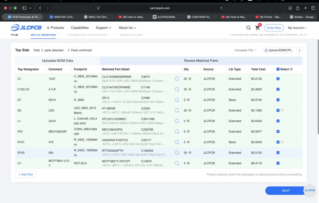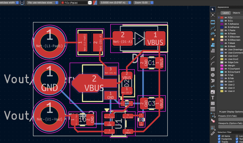 22 µH Inductor – Energy storage for the boost stage SS14 Schottky Diode – Fast, low-loss rectification Ceramic Capacitors (0805) – Input/output filtering Programming Resistor – Sets charging current Status LED – Visual charging indication