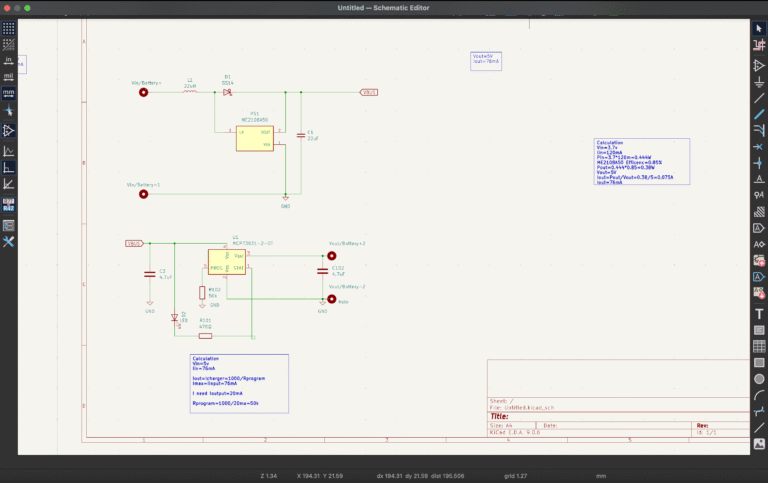 The complete schematic was designed in KiCad, including component selection, electrical calculations, and layout considerations for manufacturability.